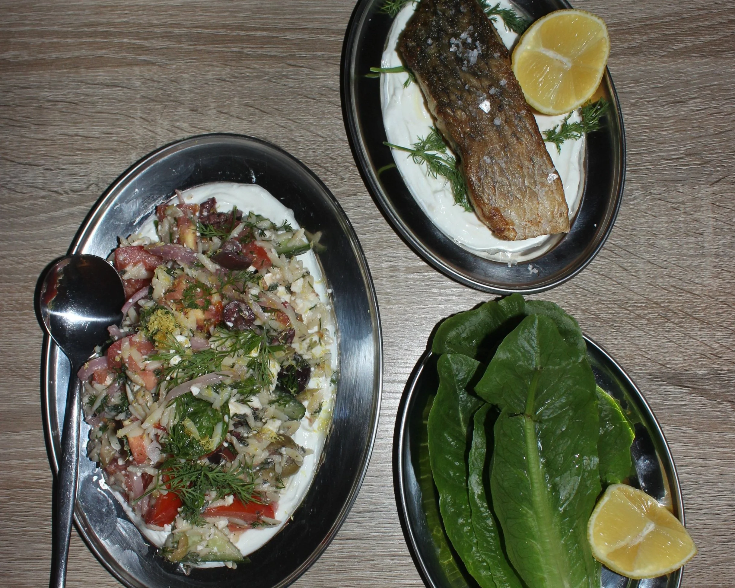 Warm Mediterranean Salad w/ Crispy Skin Barramundi